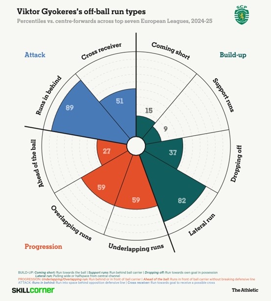 在9号位上,约克雷斯从不妥协,总会高强度向对手施压,利用自己的力量去突破对手,而这样也是大多数后卫都难易应对的。SkillCorner的追踪数据,能够帮助我们量化这种跑动能力,将他进行特定无球跑动的频率与欧洲TOP7联赛的前锋们进行对比。正如我们所看到的,约克雷斯大部分工作都是在向前移动中完成的,他很少回撤接应和串联进攻。在队友持球之时,他总是在寻求直截了当、具有破坏性的进攻方式。