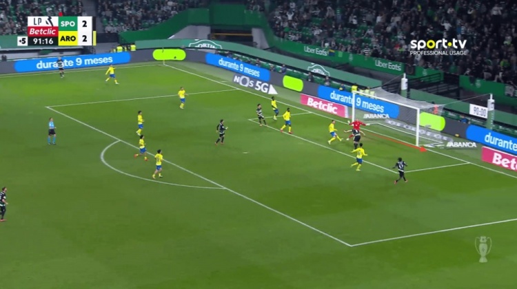 在一次快速的球权转换后,葡萄牙体育将球转移到左侧。约克雷斯毫不犹豫地启动,以全速前插,为队友提供了沿边线的传球选择。即使后卫能跟上,这种极端的跑动也会迫使他们进行盯人交接——中后卫通常不愿意跟着前锋横穿整个球场,进而导致自己完全失去位置。